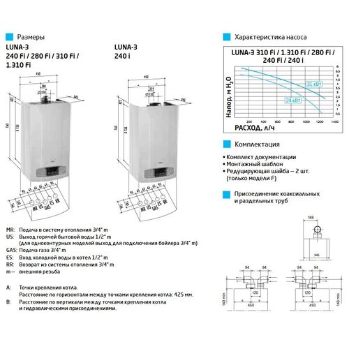 ОТОПЛЕНИЕ И ГОРЯЧАЯ ВОДА ТОЛЬКО ОТОПЛЕНИЕ ТЕХНИЧЕСКИЕ ХАРАКТЕРИСТИКИ   LUNA-3 310 Fi LUNA-3 280 Fi LUNA-3 240 Fi LUNA-3 240 i LUNA-3 1.310 Fi               Макс. полезная тепловая мощность кВт 31 28 25 24 31 Мин. полезная тепловая мощность кВт 10,4 10,4 9,3 9,3 10,4 Макс. потребляемая тепловая мощность кВт 33,3 26,9 26,9 26,3 33,3 Мин. потребляемая тепловая мощность кВт 11,9 10,6 10,6 10,6 11,9 Макс. расход природного/сжиженного газа м3/ч (кг/ч) 3,52 (2,63) 3,18 (2,34) 2,84 (2,12) 2,78 (2,07) 3,52 (2,63) Макс. производительность (КПД) % 93,1 93 92,9 91,2 93,1 Производительность (КПД) при 30% мощности % 90,8 90,6 90,2 88,7 90,8 Емкость/давление заполнения расшир. бака л/бар 10/0,8 10/0,8 8/0,8 8/0,8 10/0,8 Камера сгорания   закр. закр. закр. откр. закр.